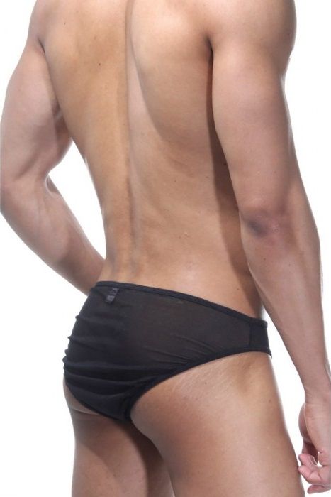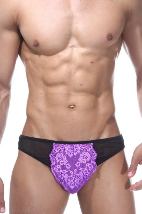 Черно-фиолетовые слипы для мужчин с низкой посадкой. На ягодицах и по бокам полупрозрачная черная тонкая ткань, а спереди яркая фиолетовая вставка из кружева.