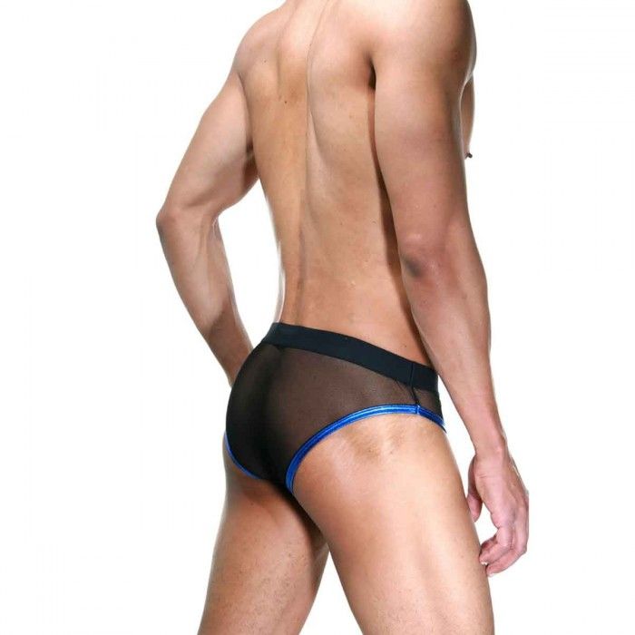 Мужские полупрозрачные трусы-слипы, с открытыми гениталиями. Окантованы яркой синей блестящей гладкой тканью, на широкой черной резинке.