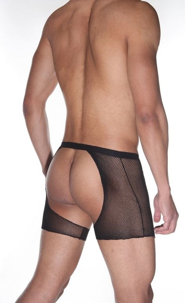 Черного цвета джоки, оригинального пошива. Трусы сшиты из двух видов материалов - мелкой сетки и черного тянущегося гладкого материала на гульфике в мелкую поперечную полоску. Ягодицы полностью открыты. Пояс неширокий, хорошо тянущийся.