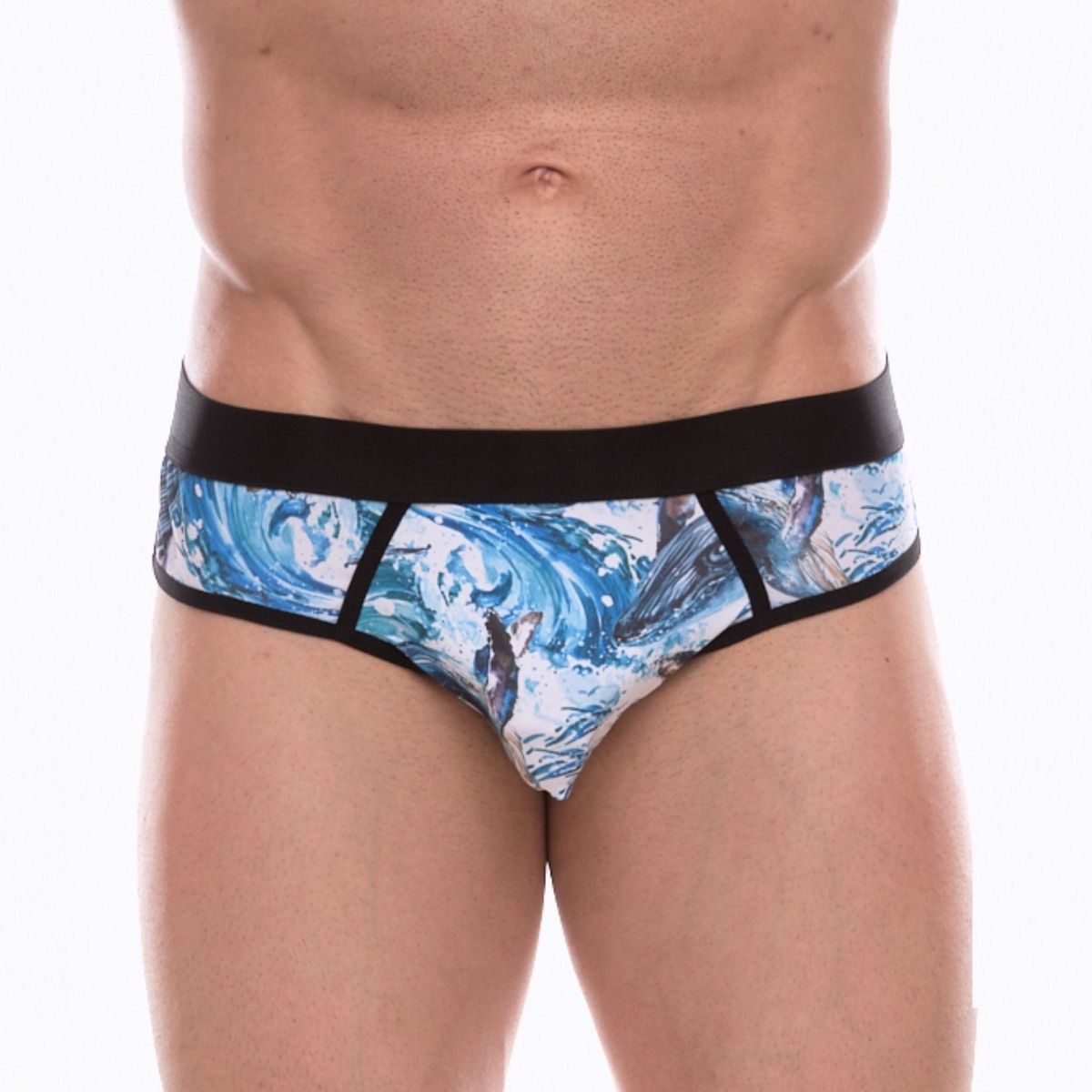 Мужские трусы-джоки с принтом в виде волн и китов.