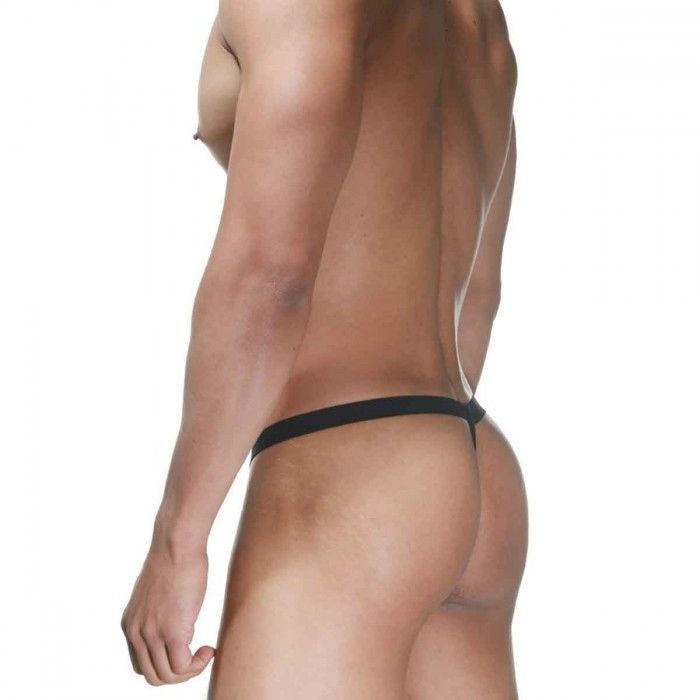 Розово-черные трусы-стринги с серебристыми кольцами.