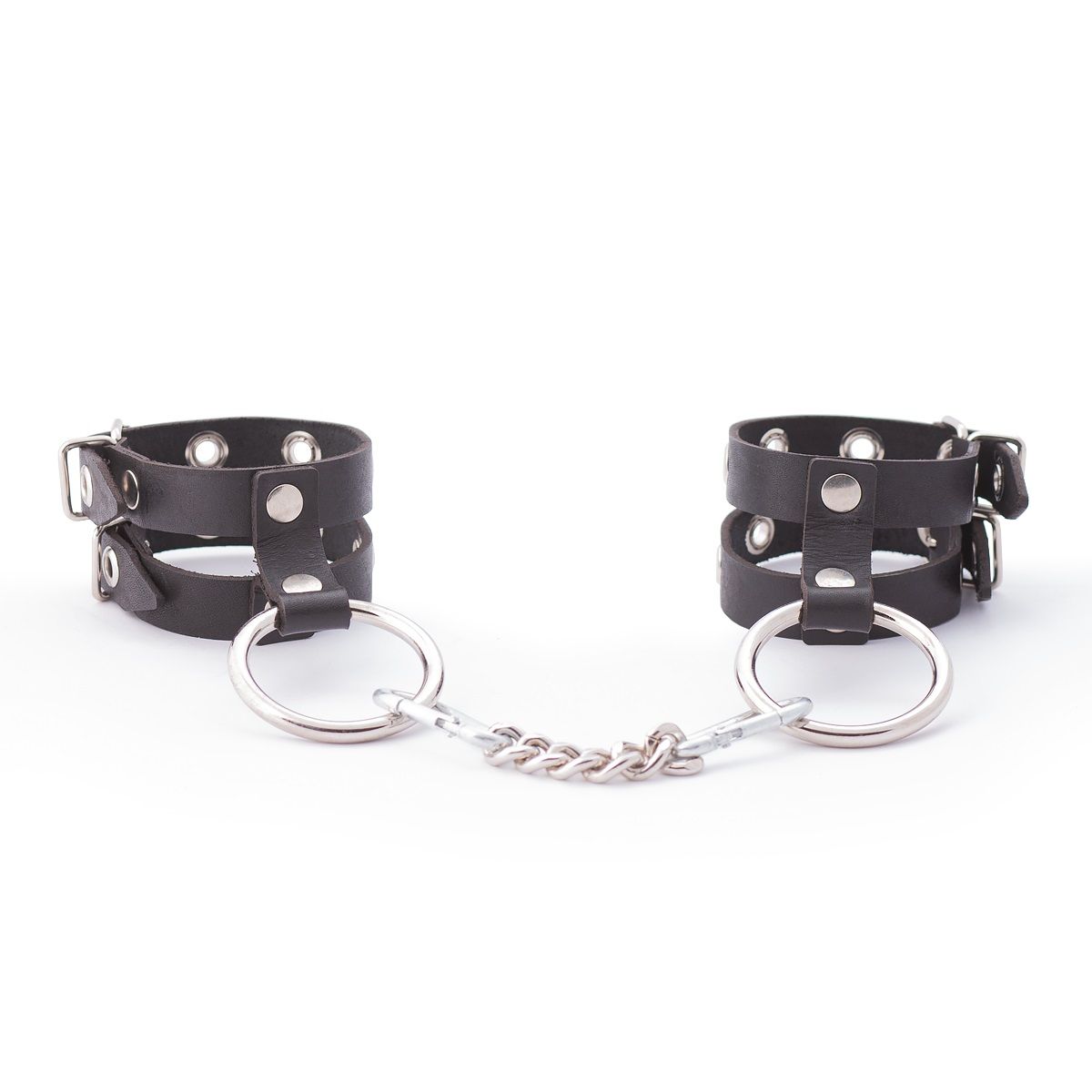 Наручники представляют собой два ремешка из натуральной кожи, соединенных посередине. Минималистичный дизайн позволяет использовать их не только для фиксации рук в любовных играх, но и в качестве аксессуара для дополнения образа. В комплекте стальное кольцо и соединительный элемент в виде прочной цепочки с двумя карабинами. Общая длина изделия - 23 см. Ширина - 5 см. Обхват - 12-21 см.