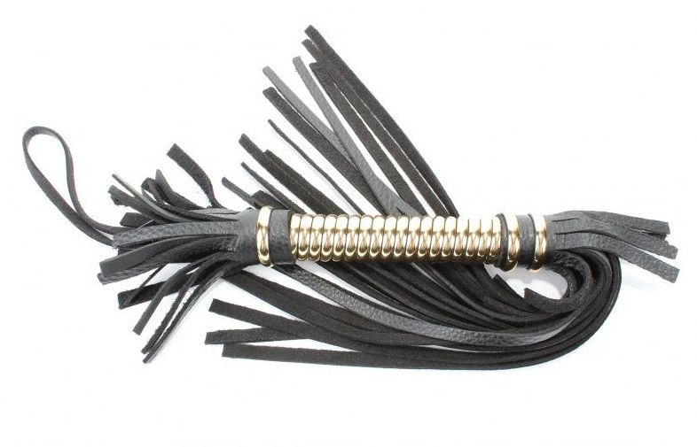 Чёрная кожаная плетка с золотистой рукоятью.