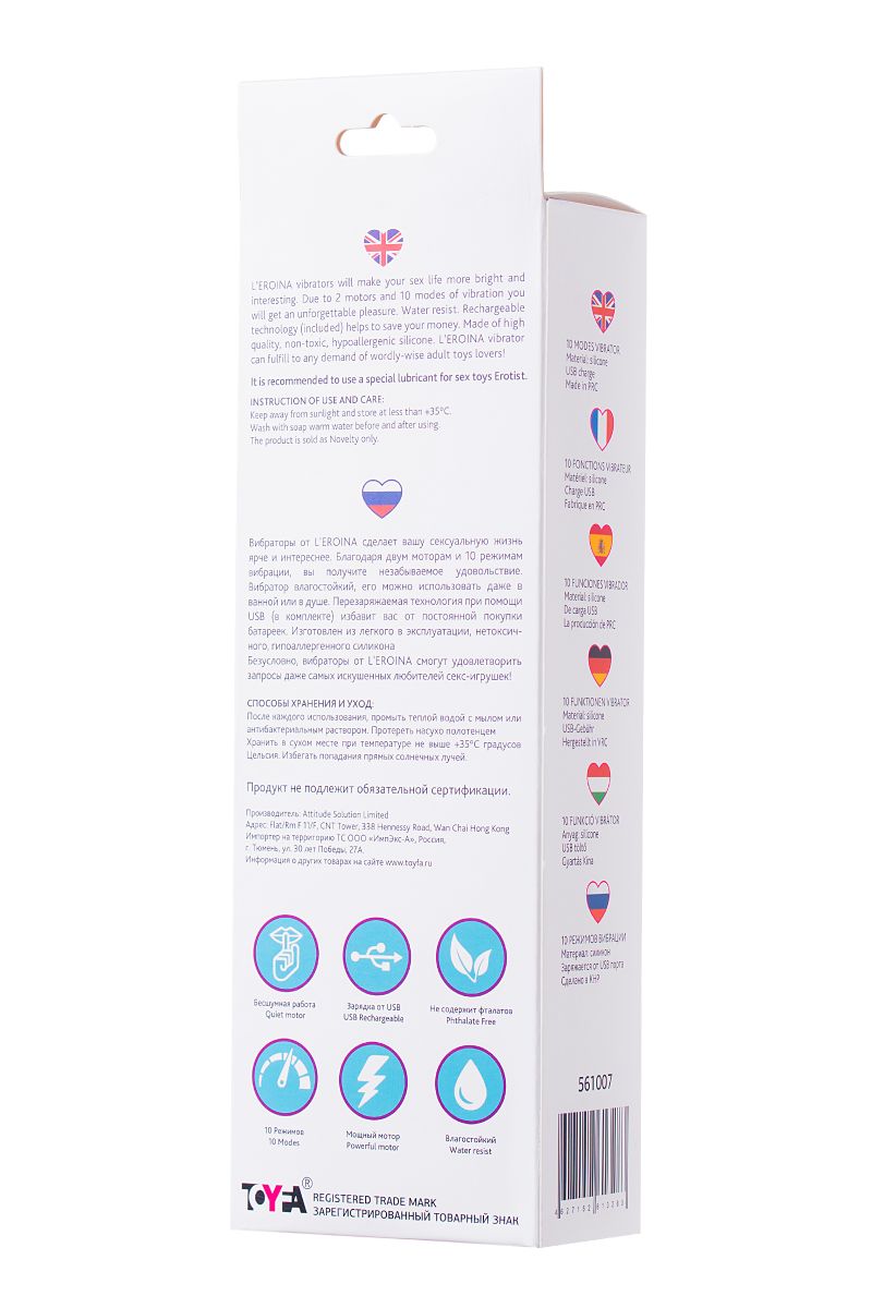 Вибраторы от LEROINA сделает вашу сексуальную жизнь ярче и интереснее. Благодаря 10 режимам вибрации, вы получите незабываемое удовольствие. Вибратор абсолютно влагостойкий, его можно использовать даже в душе. Перезаряжаемая технология при помощи USB избавит вас от постоянной покупки батареек. Изготовлен из легкого в эксплуатации, нетоксичного, гипоаллергенного силикона. Безусловно, вибратор от LEROINA сможет удовлетворить запросы даже самых искушенных любителей секс-игрушек! Не требует батареек и заряжается с помощью USB-провода (в комплекте). Рабочая длина - 12 см.